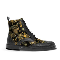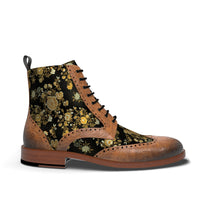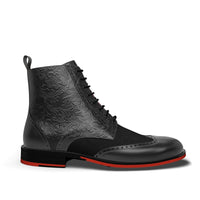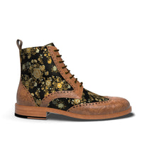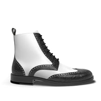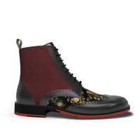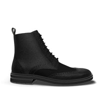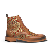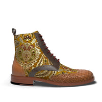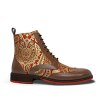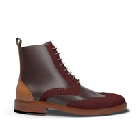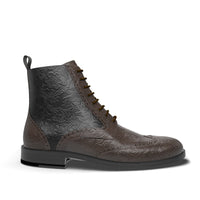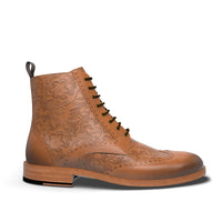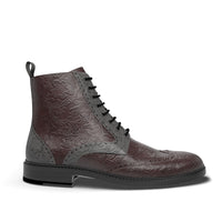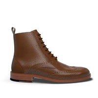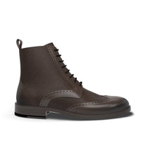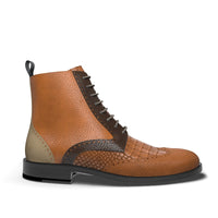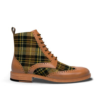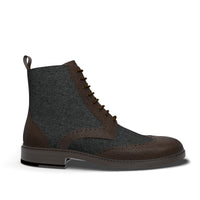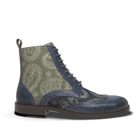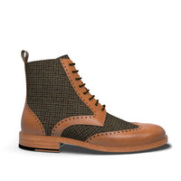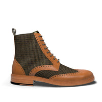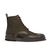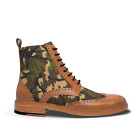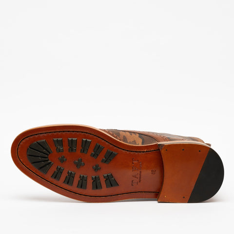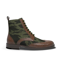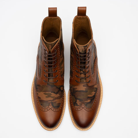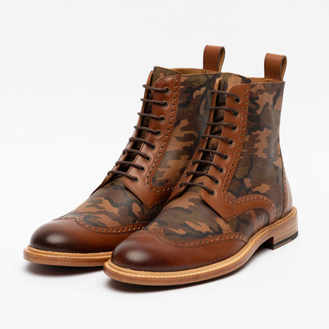 Meet the Saint Boot in Camo. There are not many shoe factories in the world that would attempt such a boot and we are grateful that our Spain team was equal to the task. This boot features a wingtip leather boot with woven inlay. This is our highest profile boot we have ever released, coming in at a full seven inches. The brown leather features a heavy grain and broguing throughout. As always, the boot is fully-lined with calfskin and handmade in Spain.